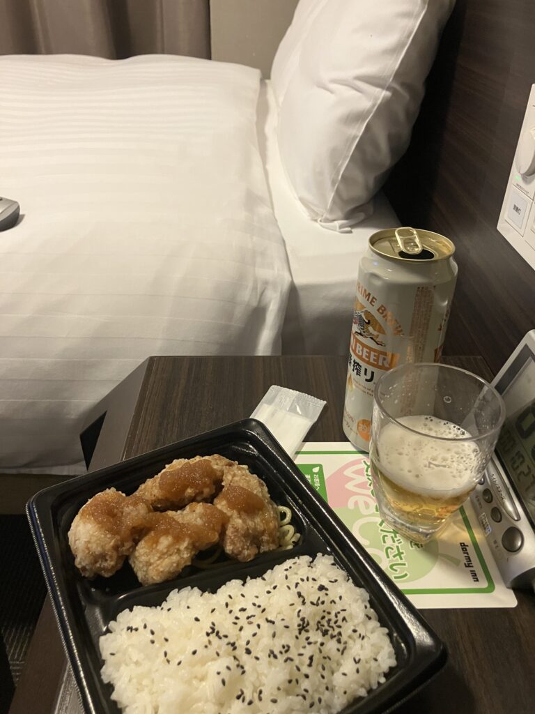 飲みに行く気力が無かったので、夕食はローソンの唐揚げ弁当とキリンラガービールです。