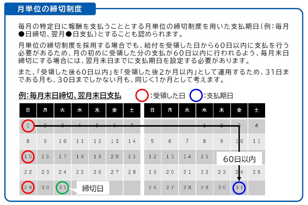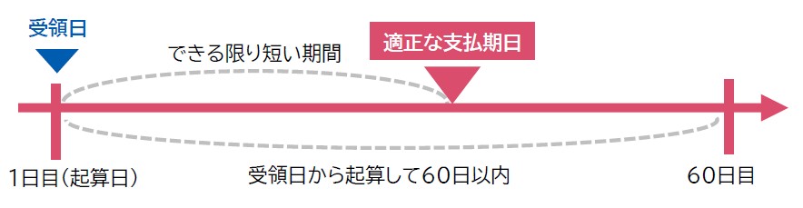 発注事業者は、給付を受領した日から起算して60日以内の、できる限り短い期間内で支払期日を定め、その日までに報酬を支払わなければなりません。
