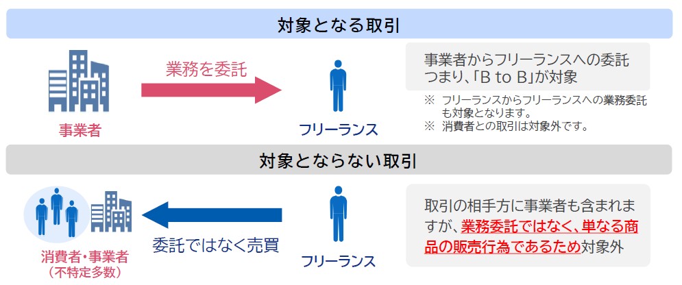 フリーランスから一般消費者(不特定多数)への商品販売などは、業務委託ではなく単なる販売行為であるため対象外です。