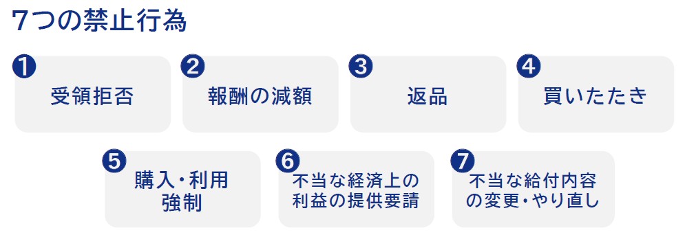 1か月以上の期間で行う業務委託(契約の更新により1か月以上継続する場合を含む)について、発注事業者は以下の7つの行為をしてはなりません。