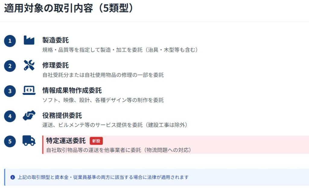 製造委託、修理委託、特定運送委託、情報成果物作成委託、役務提供委託(プログラム作成、運送、物品の倉庫保管、情報処理に限る)