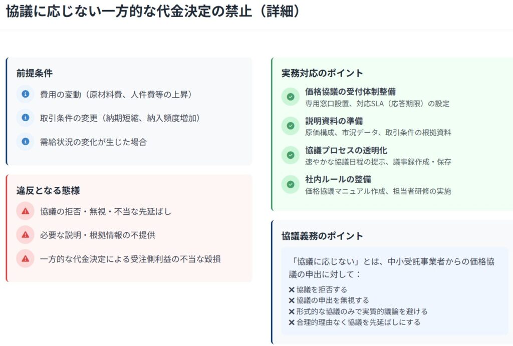 中小受託事業者から価格協議の求めがあった場合、委託事業者は協議に応じ、必要な説明・情報提供を行う義務が発生します。これを怠った一方的な代金決定は違反となります。