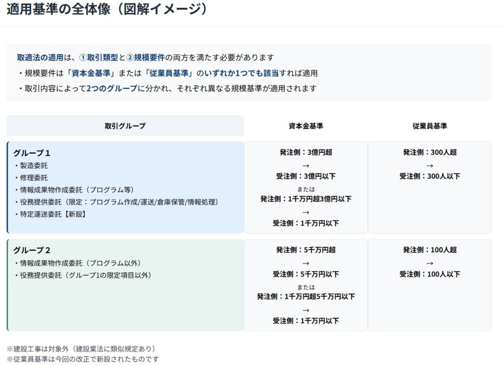 適用の可否は、取引内容と事業者の規模(資本金または従業員数)によって判断されます。