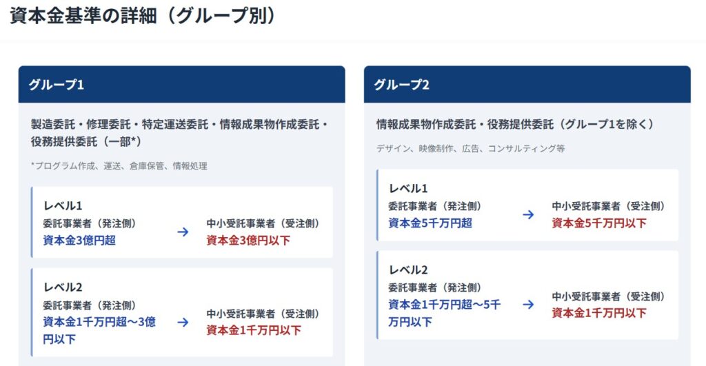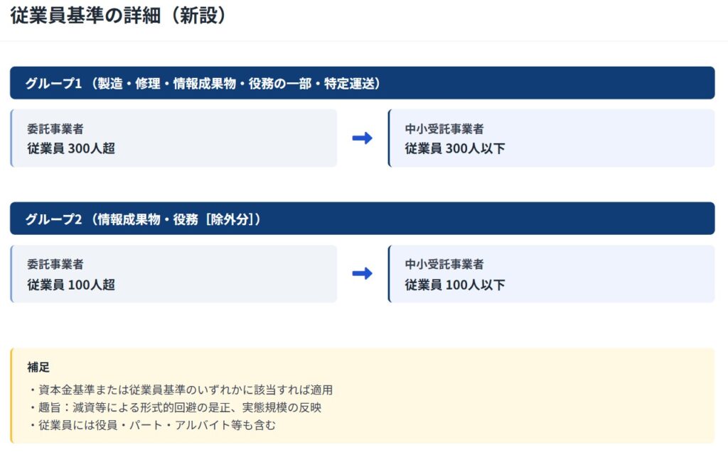 取引内容の要件に加え、規模要件(資本金基準または従業員基準)を満たす必要があります。