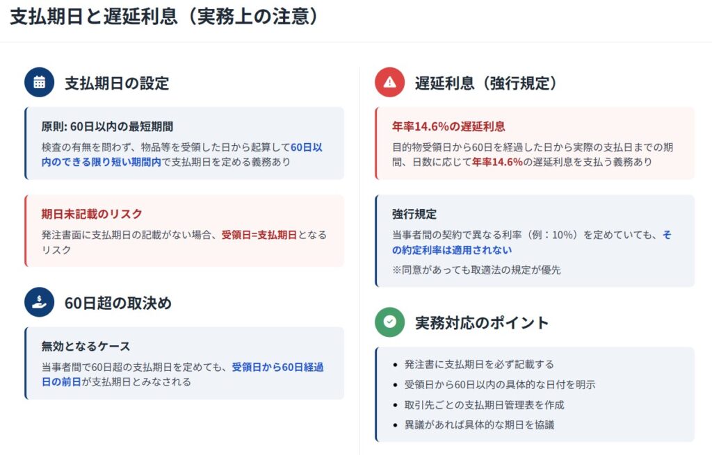 これは「60日以内に支払えば良い」という意味ではありません。60日以内の「できるだけ早い日」に支払期日を設定し、発注書面に明記しなければなりません。