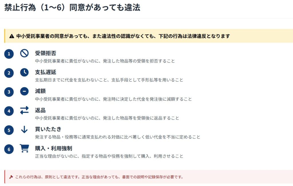 中小受託事業者の同意があっても、委託事業者に違法性の意識がなくても、以下の行為は違反となります。