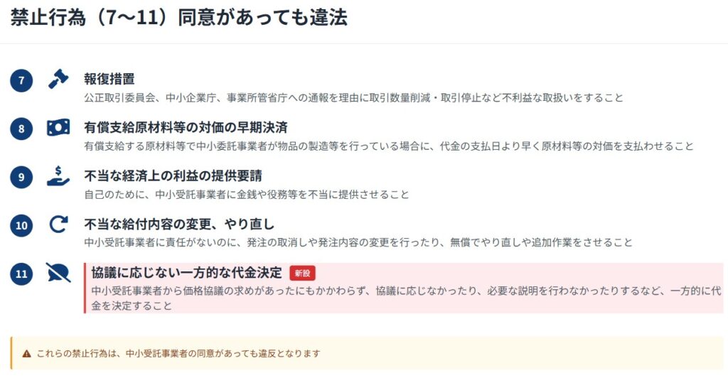 - 協議に応じない一方的な代金決定:価格協議の求めに応じない、必要な説明を行わないなど、一方的に代金を決定すること【新設】