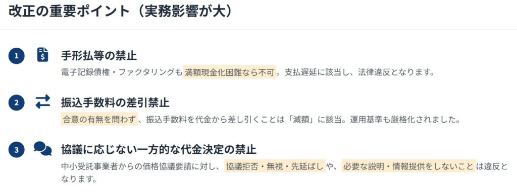 手形による支払が全面的に禁止されました。これは、手形払により発注者が受注者に資金繰りの負担を求める商慣習を是正するためです。