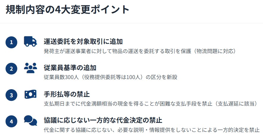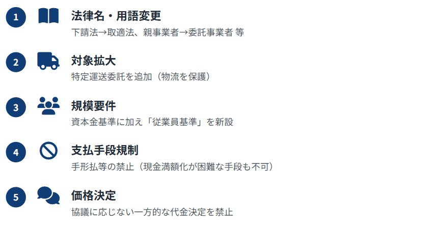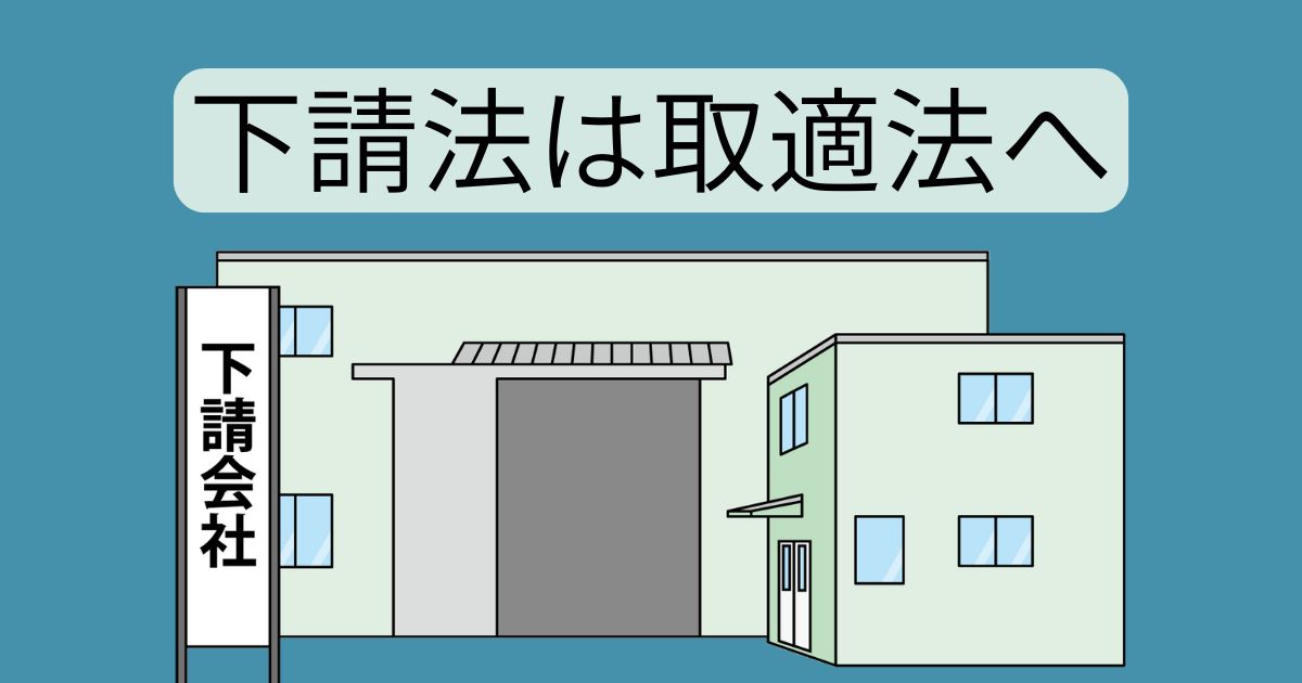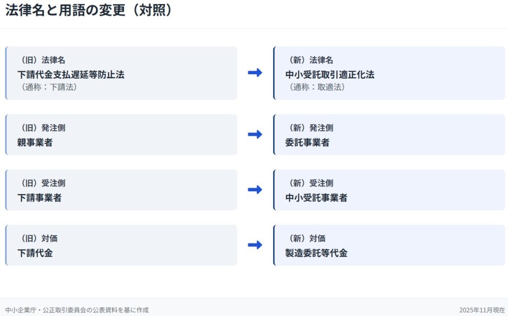 - 法律名:下請代金支払遅延等防止法(下請法) → 製造委託等に係る中小受託事業者に対する代金の支払の遅延等の防止に関する法律(取適法)